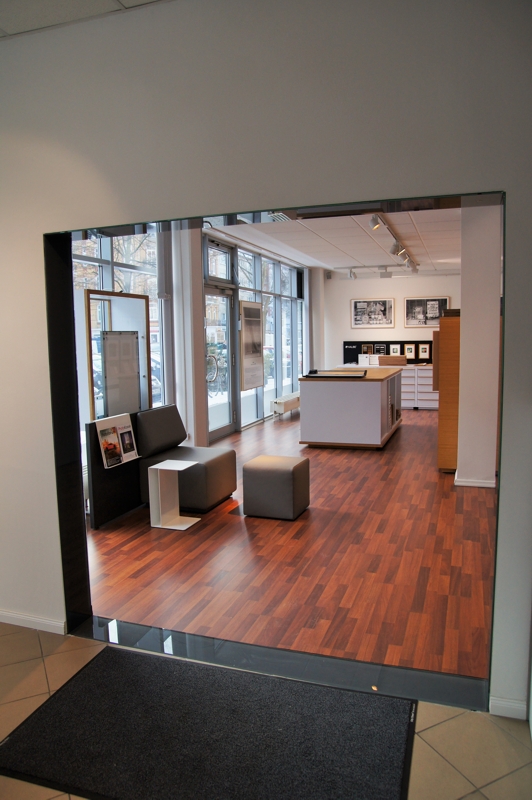 grund-form hatte den Auftrag, das Fotofachgeschäft open eyes in Hamburg für die Kunden attraktiver zu machen. Neben den klassischen Fotoarbeiten werden dort auch Papiere für den Fine Art Print sowie Rahmen der Firma Halbe angeboten. Für letztere entstand eine neue Fläche in Form eines „Shop in Shop“-Bereichs. Um die Hürde für die Kunden zu senken, vom Eingangsbereich weiter in diesen zweiten Verkaufsraum zu treten, wurde der Durchgang erweitert und so eine natürliche Verbindung zwischen den Räumen geschaffen. Darüber hinaus werden nun auch die Blicke der vorbei gehenden Passanten durch die eigens entworfenen Vitrinen in den Showroom gelenkt.